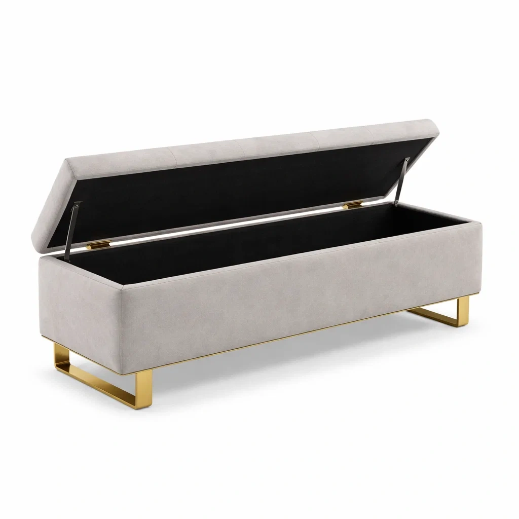 Diese Sitzbank besteht aus Polyester-Samt als Hauptmaterial mit Textilgewebe im Innenbereich. Die Beine sind aus Metall mit einer goldfarbenen Beschichtung gefertigt.